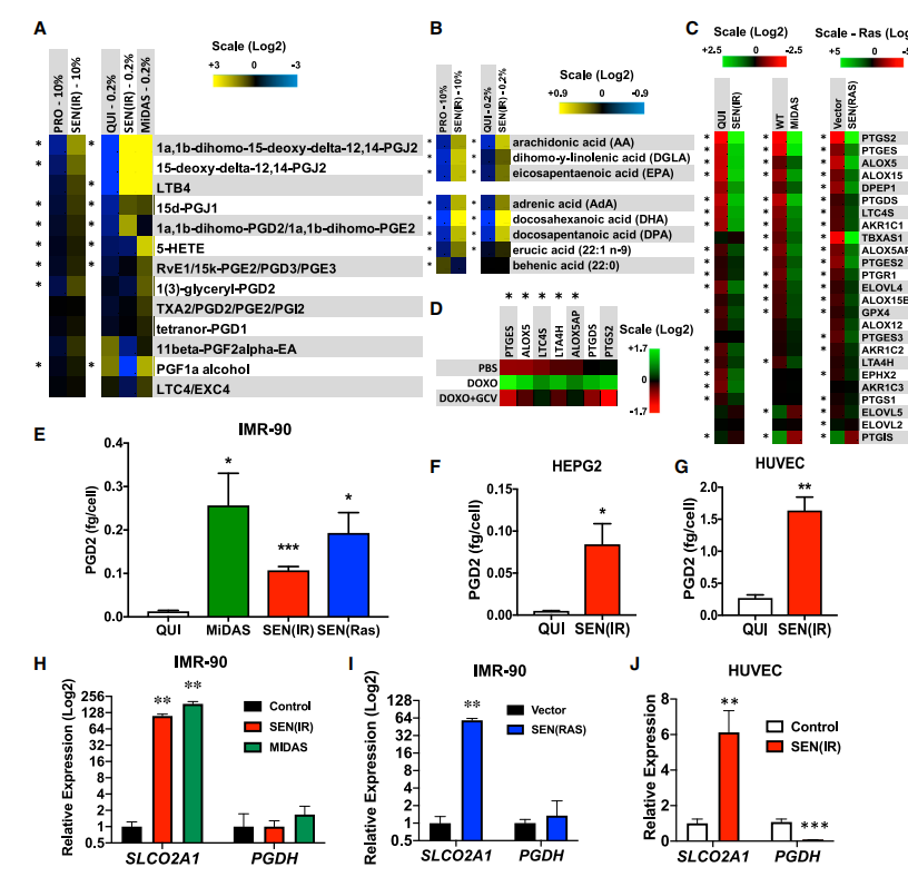 衰老细胞存在PGD2分泌增加的现象,同时前列腺素转运体SLCO2A1大幅上调、降解酶PGDH表达失衡,最终导致氧脂素在衰老细胞内特异性累积,且该合成特征也存在于老年小鼠的组织中。