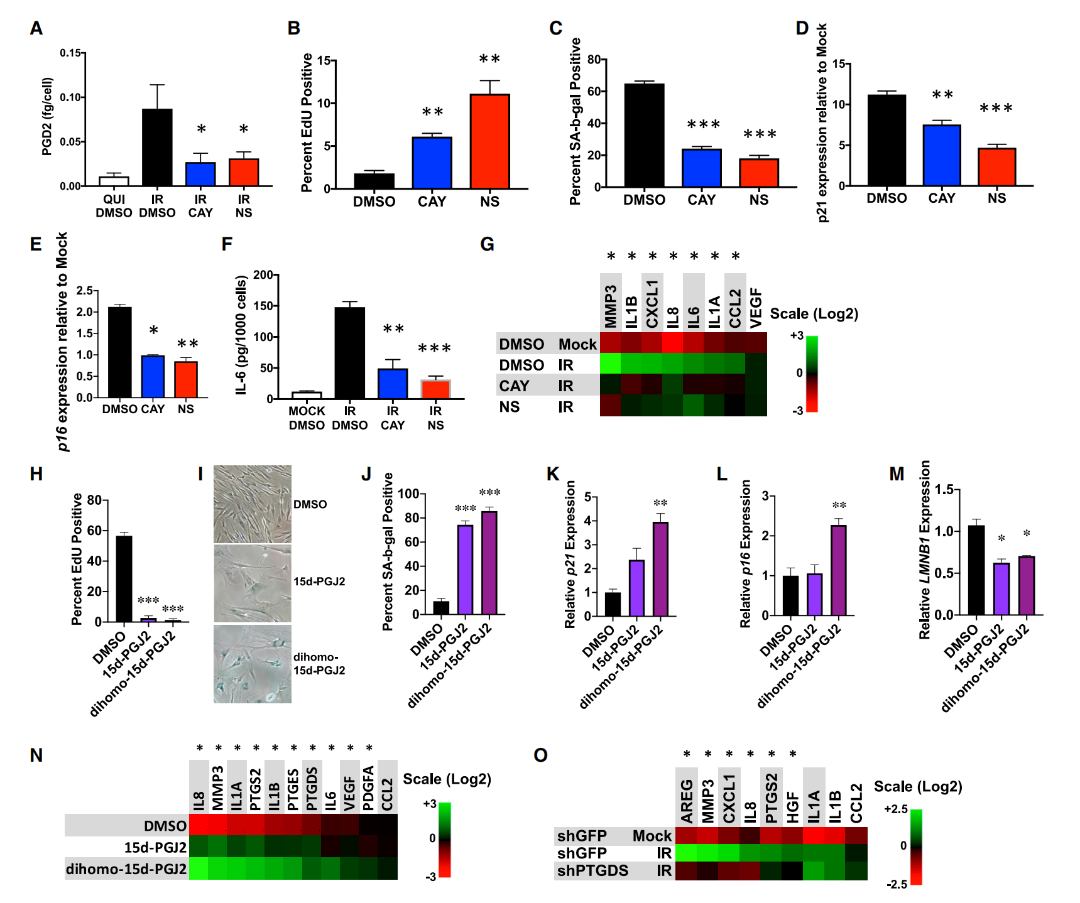 3.证功能:通过抑制剂阻断、外源性添加、基因敲低等正反实验,验证前列腺素类氧脂素对细胞衰老增殖停滞和炎症性SASP的正向调控作用,排除经典信号通路。