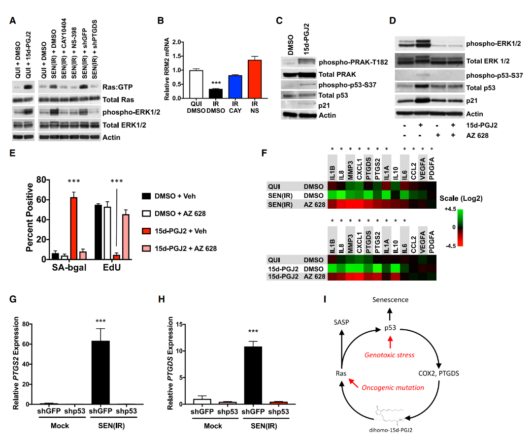 4.析机制:聚焦RAS/p53信号轴,经通路激活检测、抑制剂阻断、基因敲低等实验,证实前列腺素-RAS-p53正反馈环路是维持细胞衰老的核心分子机制。