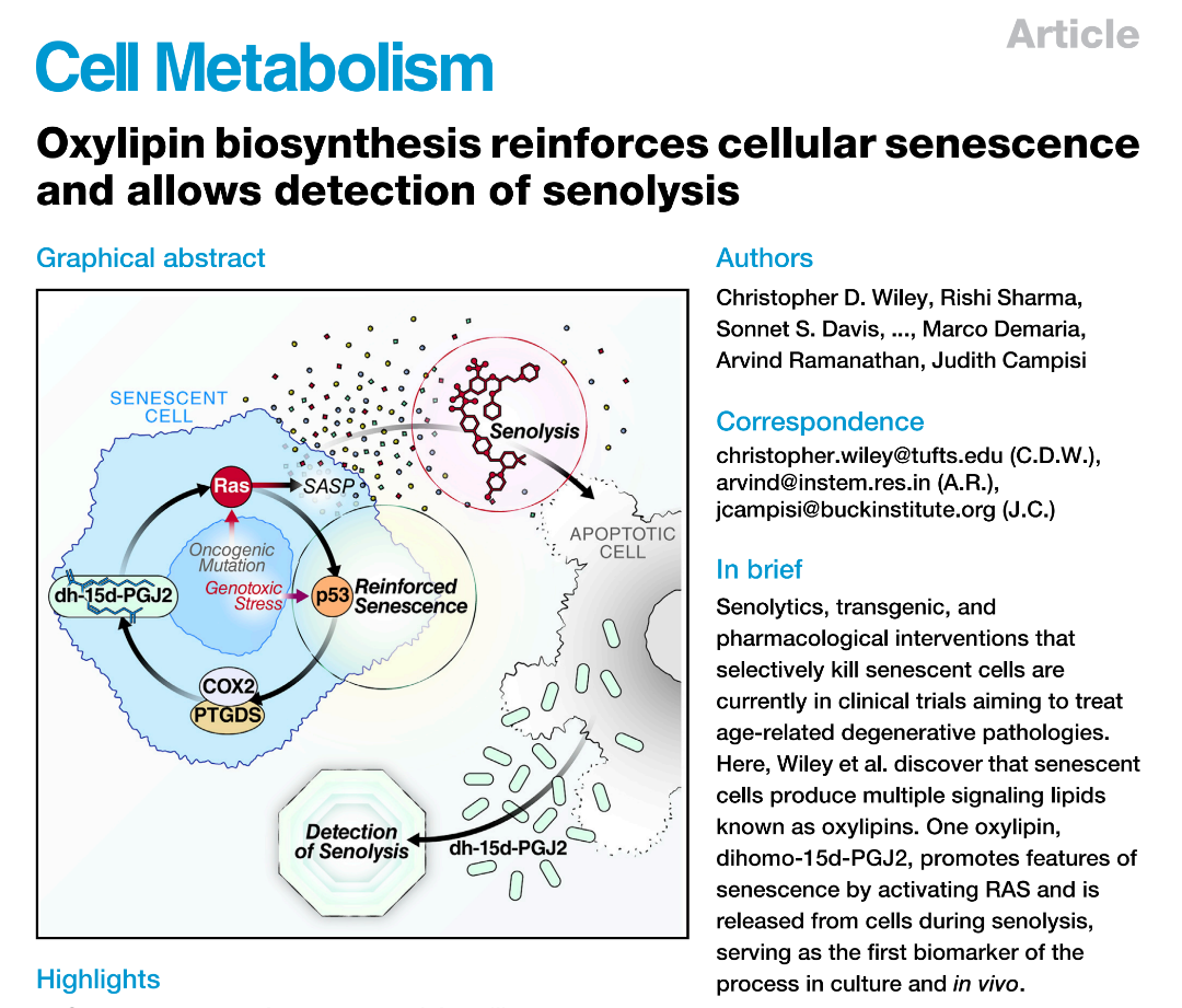 靶向清除衰老细胞的衰老细胞清除剂、转基因及药理学干预手段,目前正处于治疗年龄相关退行性疾病的临床试验阶段。本研究中,威利团队发现衰老细胞可产生多种名为氧脂素的信号脂质,其中二高-15d-前列腺素J2这一氧脂素能通过激活RAS信号通路促进细胞衰老表型的形成,且该物质会在衰老细胞清除过程中从细胞内释放,成为首个能在体外细胞培养及动物体内检测这一过程的生物标志物。