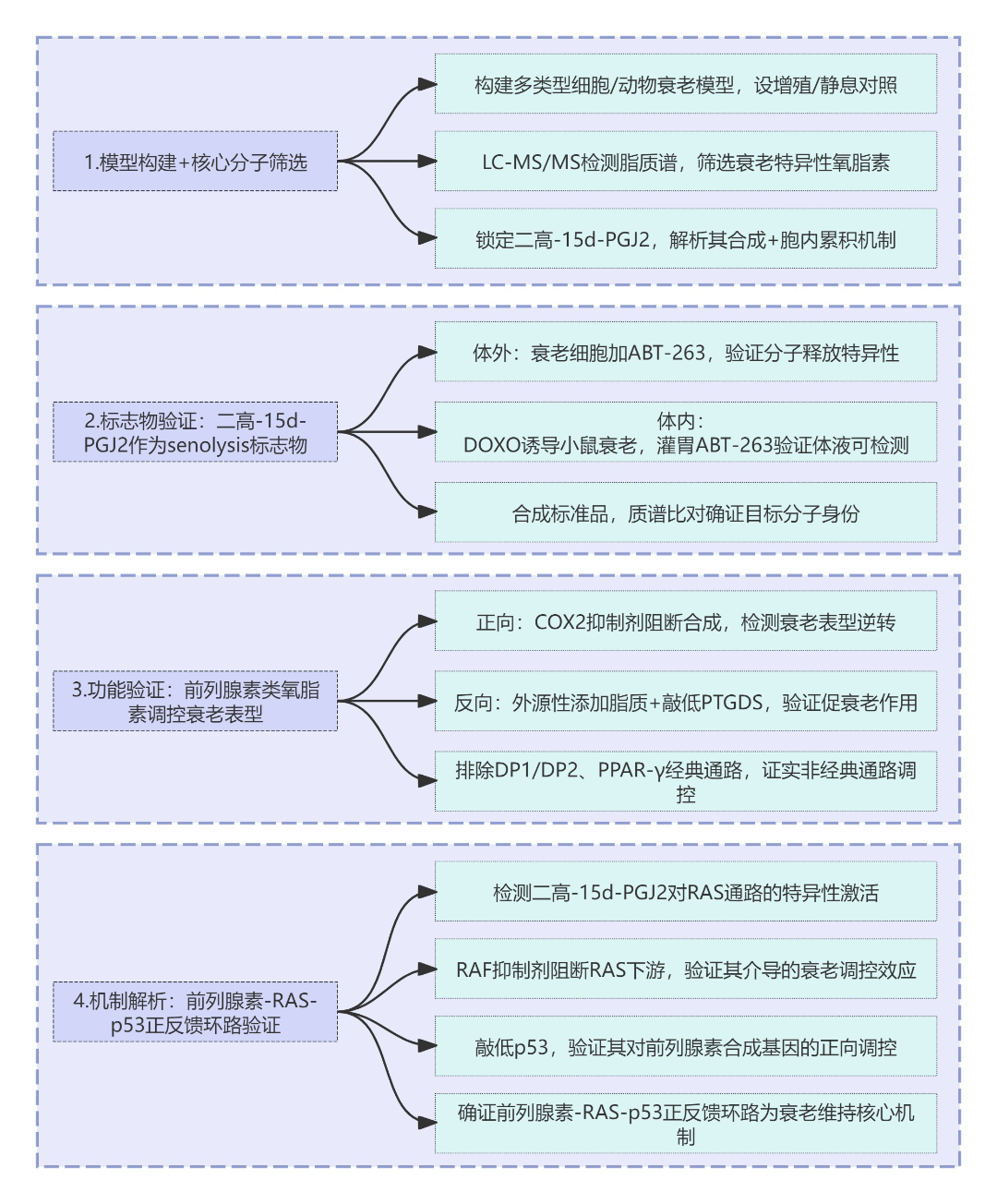 1.筛分子:构建多类型细胞/动物衰老模型,通过脂质谱分析筛选出衰老细胞特异性合成累积的氧脂素,锁定二高-15d-PGJ2为核心分子,解析其合成及胞内累积机制。