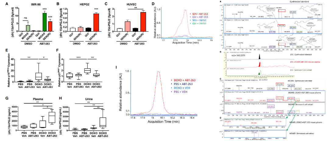 利用人工合成的二高-15d-PGJ2标准品完成质谱比对,目标分子的保留时间、碎片峰与标准品完全一致,精准确证其身份,证实该分子为首个可在体内外检测衰老细胞清除的生物标志物。