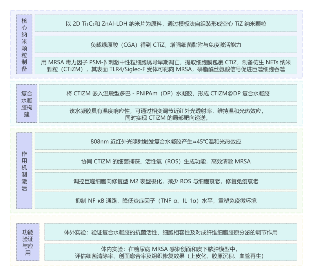 本文针对MRSA感染糖尿病慢性创面的治疗难题,借鉴天然NETs的抗菌与免疫调节功能,设计了CTiZM@DP复合水凝胶:以Ti3C2/ZnAl-LDH为基础构建空心纳米颗粒并负载绿原酸,包裹凋亡中性粒细胞膜形成仿生NETs(CTiZM),嵌入温敏水凝胶后,经近红外光触发温和光热效应,协同实现MRSA清除、巨噬细胞M2极化及免疫衰老修复,最终促进创面愈合。