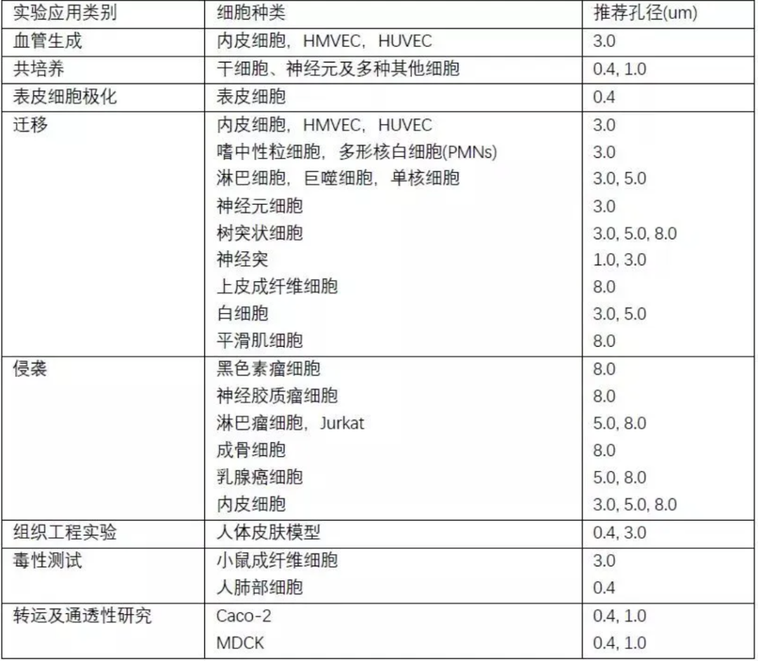 而在细胞迁移实验及侵袭实验中,细胞需要穿过上室的膜、到达膜的背侧(少数情况下会落至下室中,如悬浮细胞的迁移/侵袭实验),因此需要选择较大孔径。