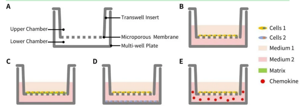 通过将细胞种植在小室上室(含可渗透膜的上部空间),并在下室添加诱导因子或化学趋化剂,研究细胞穿过膜的能力,模拟细胞在体内迁移和侵入周围组织的过程